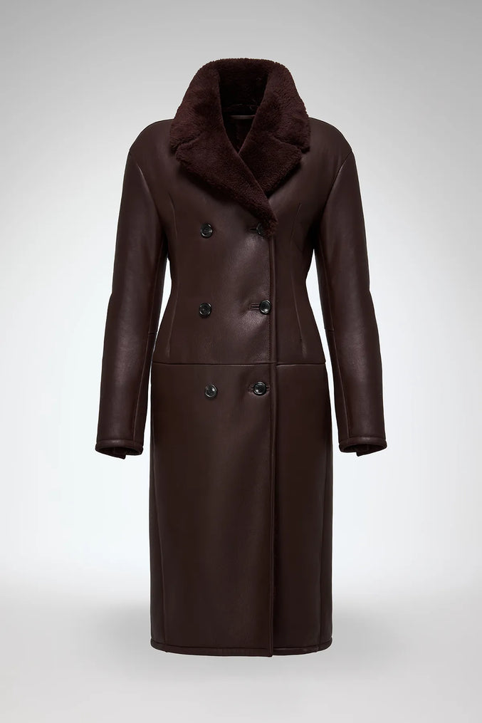 • Key Features: Double-breasted button closure, notched shearling-lined collar, tailored trench silhouette, waist darts for shaping, side slit pockets